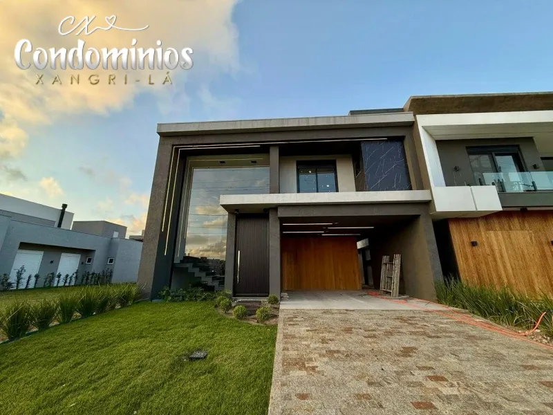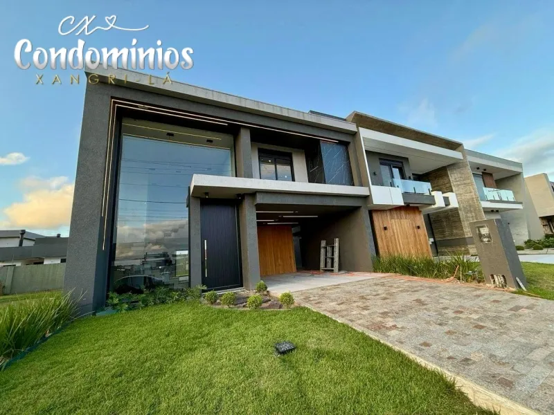 Sobrado no Condomínio Fechado Sunset, com projeto moderno e excelente localização. Com 212m² de área privativa, possui 04 suítes individuais sendo 01 térrea, living 02 ambientes com lareira, lavabo, cozinha americana com churrasqueira, lavanderia e depósito, abrigo para 02 carros, persianas automatizadas.